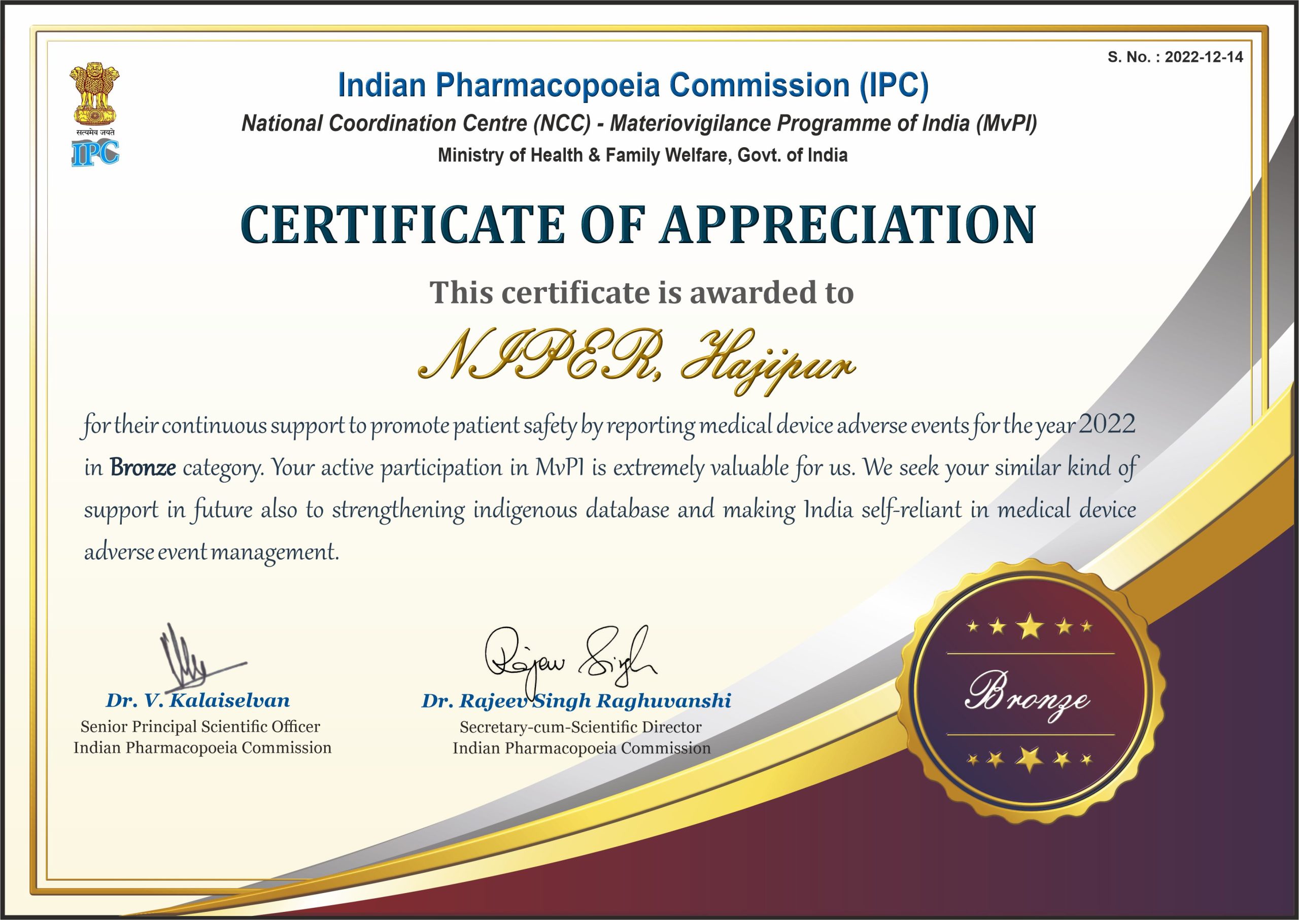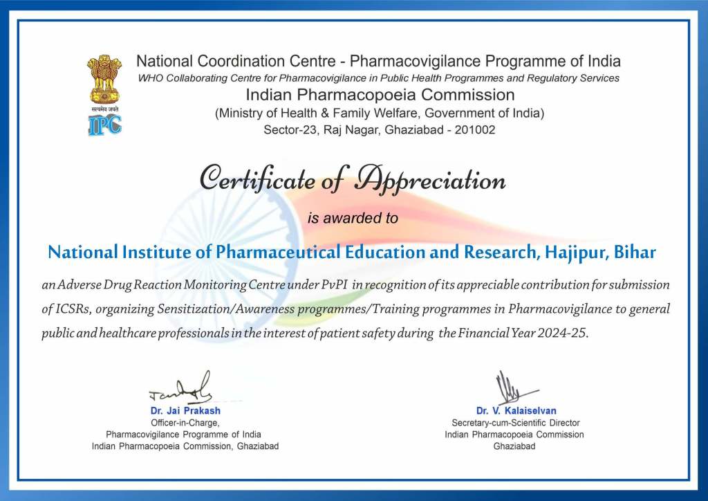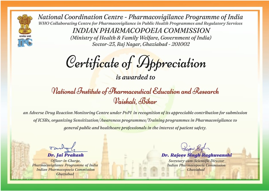 The Pharmacovigilance Programme of India (PvPI) is an initiative by the Central Drugs Standard Control Organization (CDSCO) in collaboration with the Indian Pharmacopoeia Commission (IPC), operating under the Ministry of Health and Family Welfare, Government of India. The program aims to monitor adverse drug reactions (ADRs) and ensure the safety of medicines in the country, thereby improving patient safety. NIPER Hajipur is one of the recognized centers for reporting adverse drug reactions associated with medicines in Bihar to the Indian Pharmacopeia Commission, Ghaziabad (IPC).