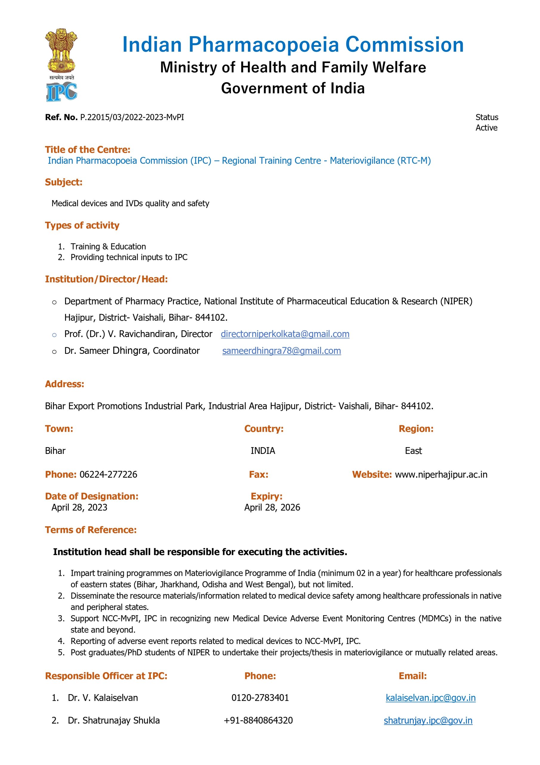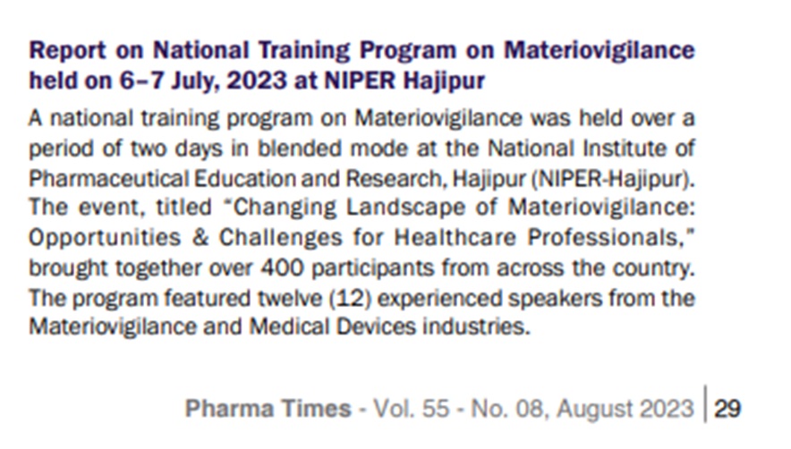 The Materiovigilance Programme of India (MvPI) is an initiative taken by Central Drugs Standard Control Organization (CDSCO) in collaboration with the Indian Pharmacopoeia Commission (IPC), which operates under the Ministry of Health and Family Welfare, Government of India. The program focuses on monitoring and ensuring the safety of medical devices in the country and hence improving patient safety. NIPER Hajipur is one of the recognised centres for reporting adverse events associated with medical devices in the Bihar State to the Indian Pharmacopeia Commission, Ghaziabad (IPC).